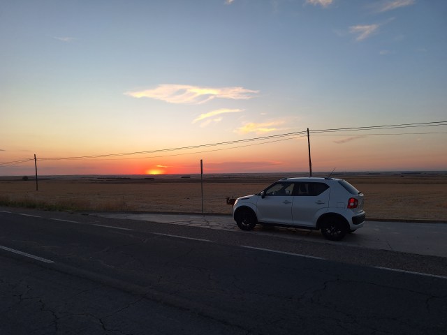 Et me voici arrivé à Fontiveros à la nuit tombée. Mais juste avant, j’ai pu prendre la photo du coucher du soleil. Je n’ai pas pris de photo avant parce que les Pyrénées étaient dans le brouillard lorsque je les ai franchies en fin de matinée.