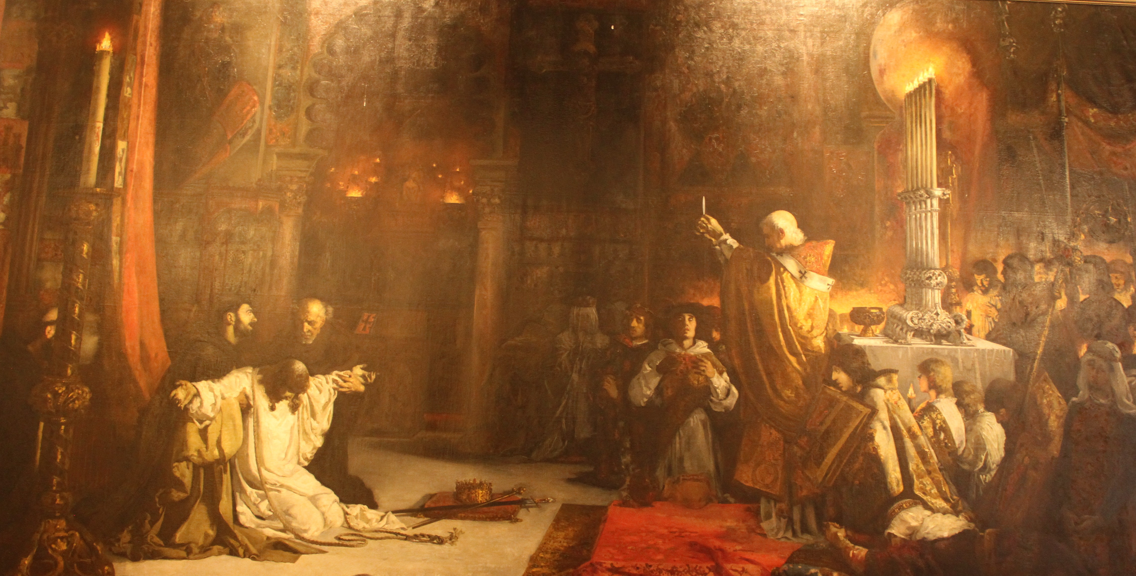 Cette peinture représente un roi d’Espagne, mourrant à la suite d’un combat, qui assiste, supporté par des moines, au saint sacrifice de la messe. Image pathétique d’une époque rude.