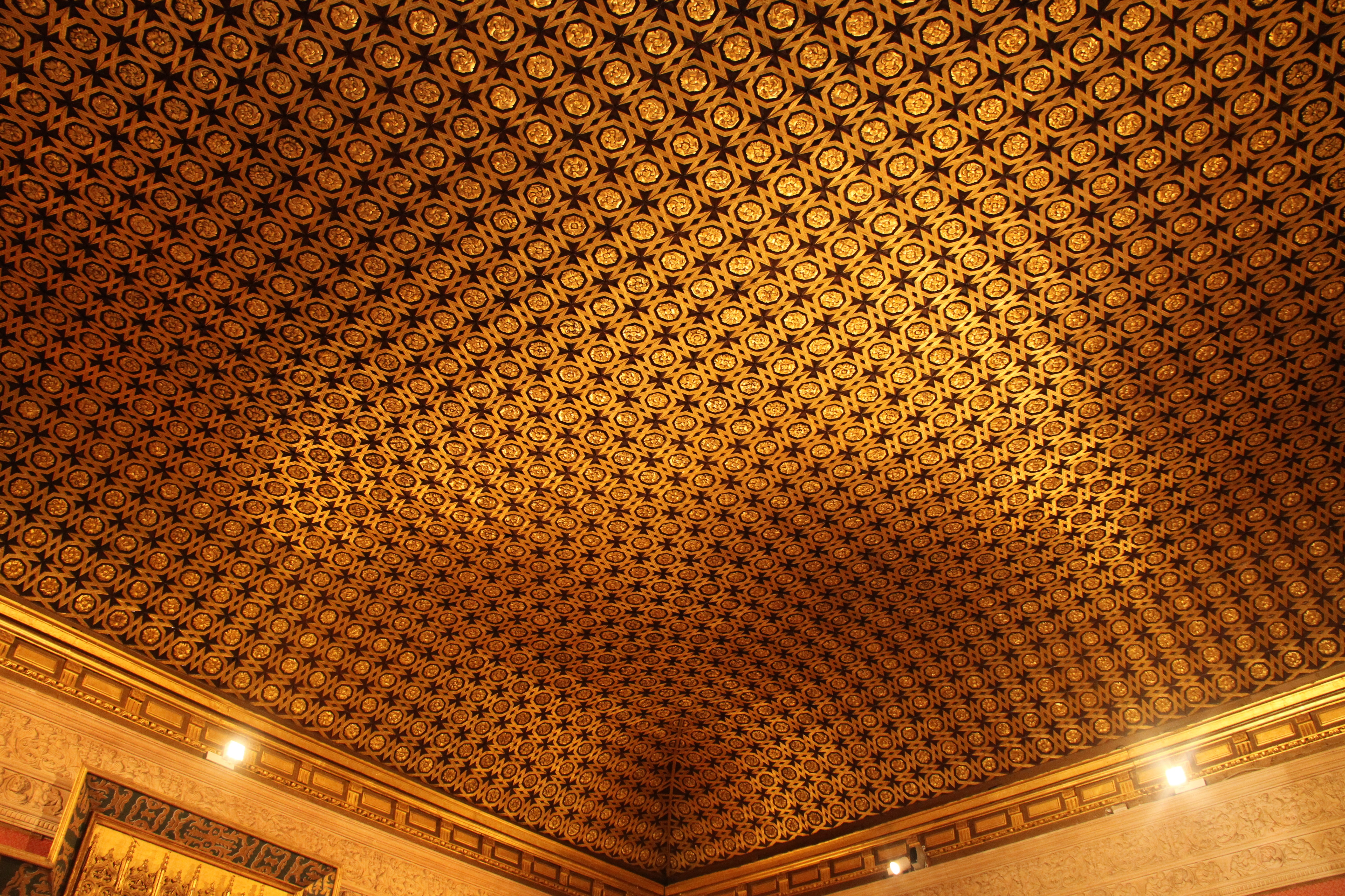 Une entrée entre deux bâtiments, déjà nous voyons la délicatesse des pierres et la finesse des sculptures. Un plafond avec des croix de Malte et des sortes de fleurs : pas une seule de pareille.