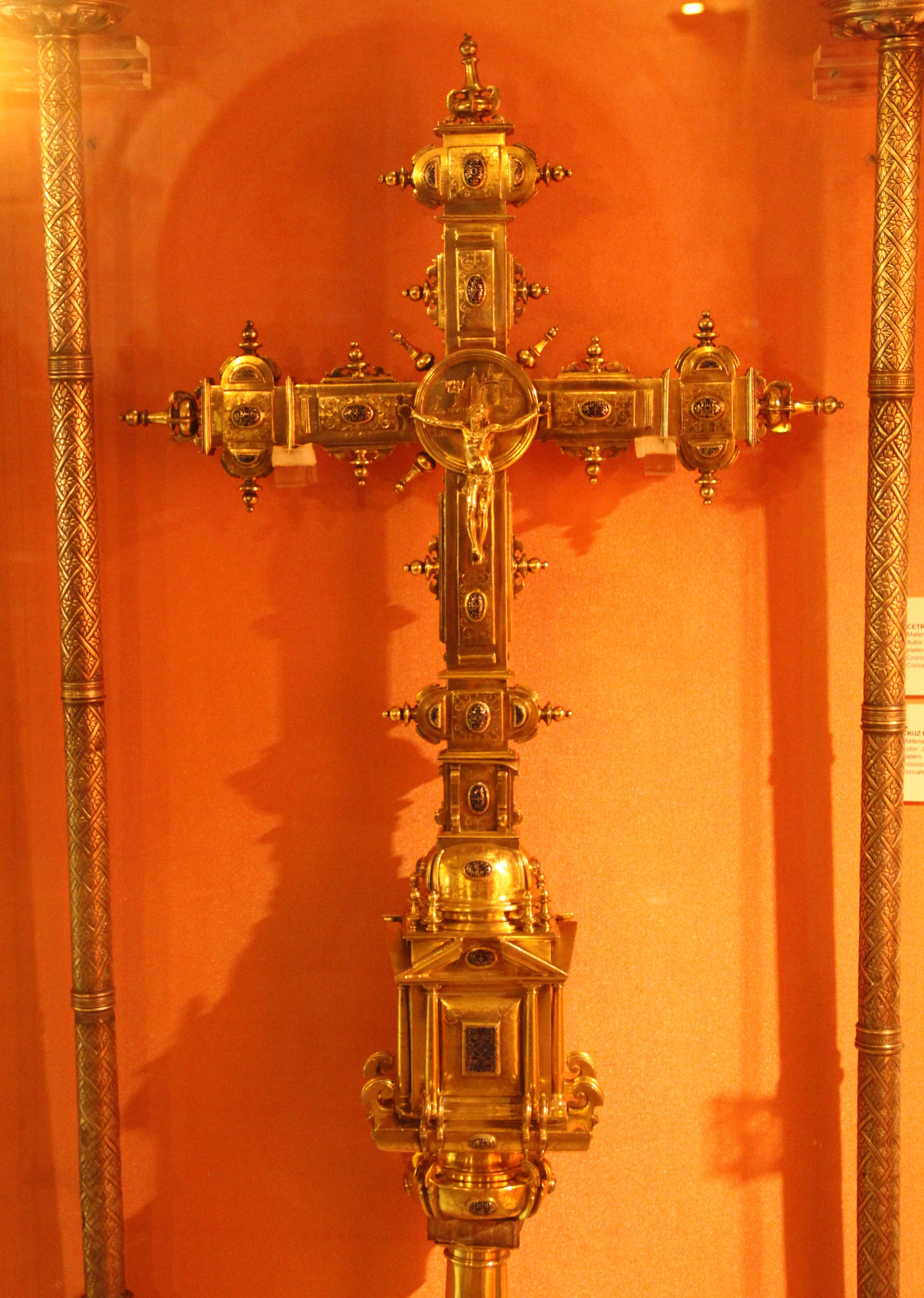 Une troisième chose m’a interpellé : dans le trésor, j’ai découvert une croix de procession qui ressemble étrangement à celle de Parisot qui est une croix reliquaire (il y a des reliques au centre de la croix), et elle est en argent alors qu’ici, à Cacerès, elle est en argent doré.