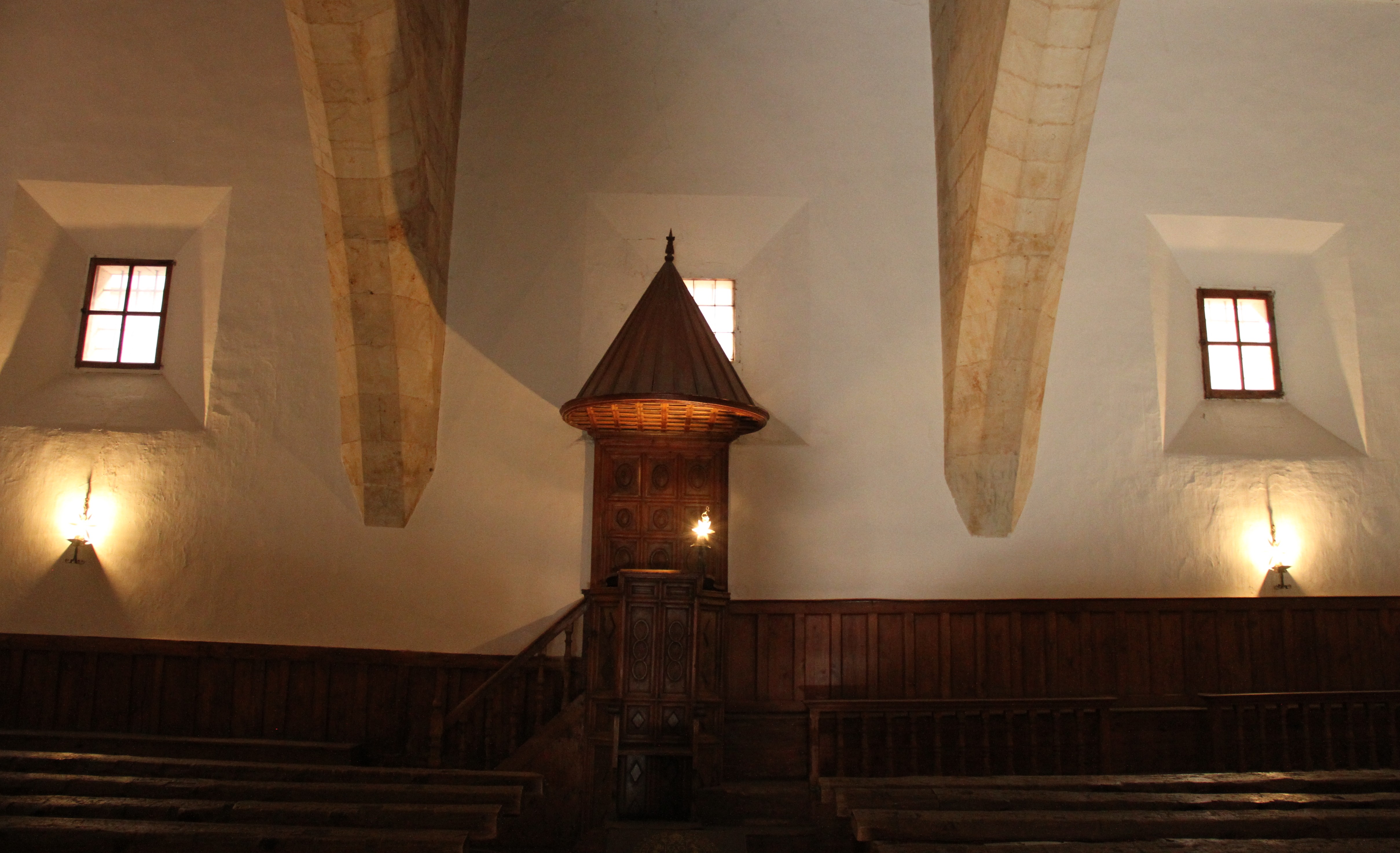 La voûte au-dessus du choeur, ainsi que les piliers donnent un peu de légèreté à l’ensemble. Quelques objets remarqubles : les stales en bois, très bien présentées : on peu facilement les photographier par la disposition ingénieuse de l’éclairage :