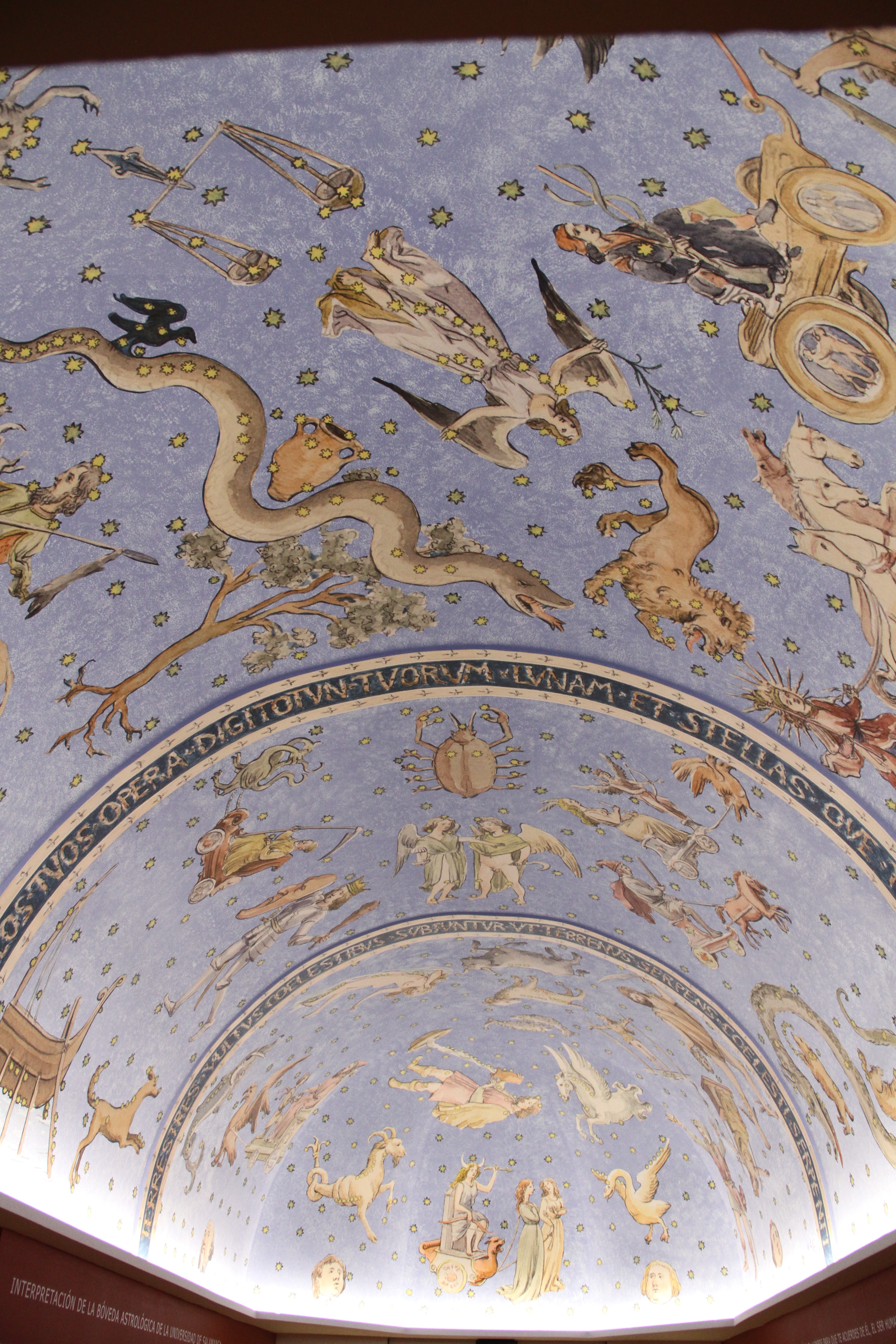Et dans cette université, un domaine a été travaillé de très près, c’est la cosmogonie, soit comment est fait le ciel et ce qu’il est possible de comprendre quand l’optique et les découvertes de Newton, Galilée et Copernic font bonger les recherches. A Salamanque, on cherche comment ordonner et cela donne ceci qui n’est qu’une part de ce que l’on appelle le ciel de Salamanque :