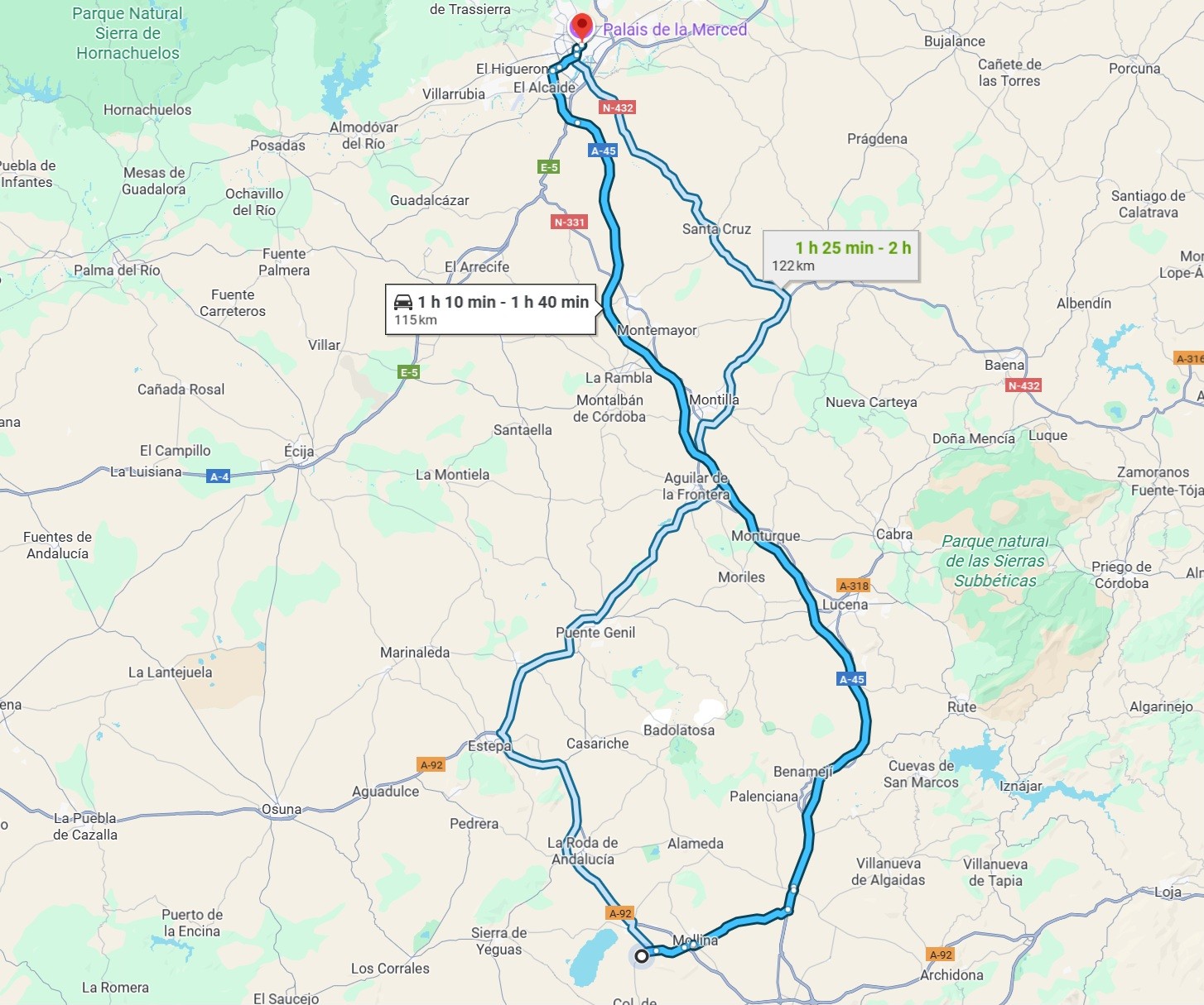 Notez, sur ce batiment, nous ne sommes pas loin du moucharabieh de Casablanca. C’est encore plus vrai à Malaga. Nous en reparlerons lorsque nous y serons arrivés. Et après un dernier coup d’oeil à la ville, je reprends la voiture. Direction la maison Sierrecilla.