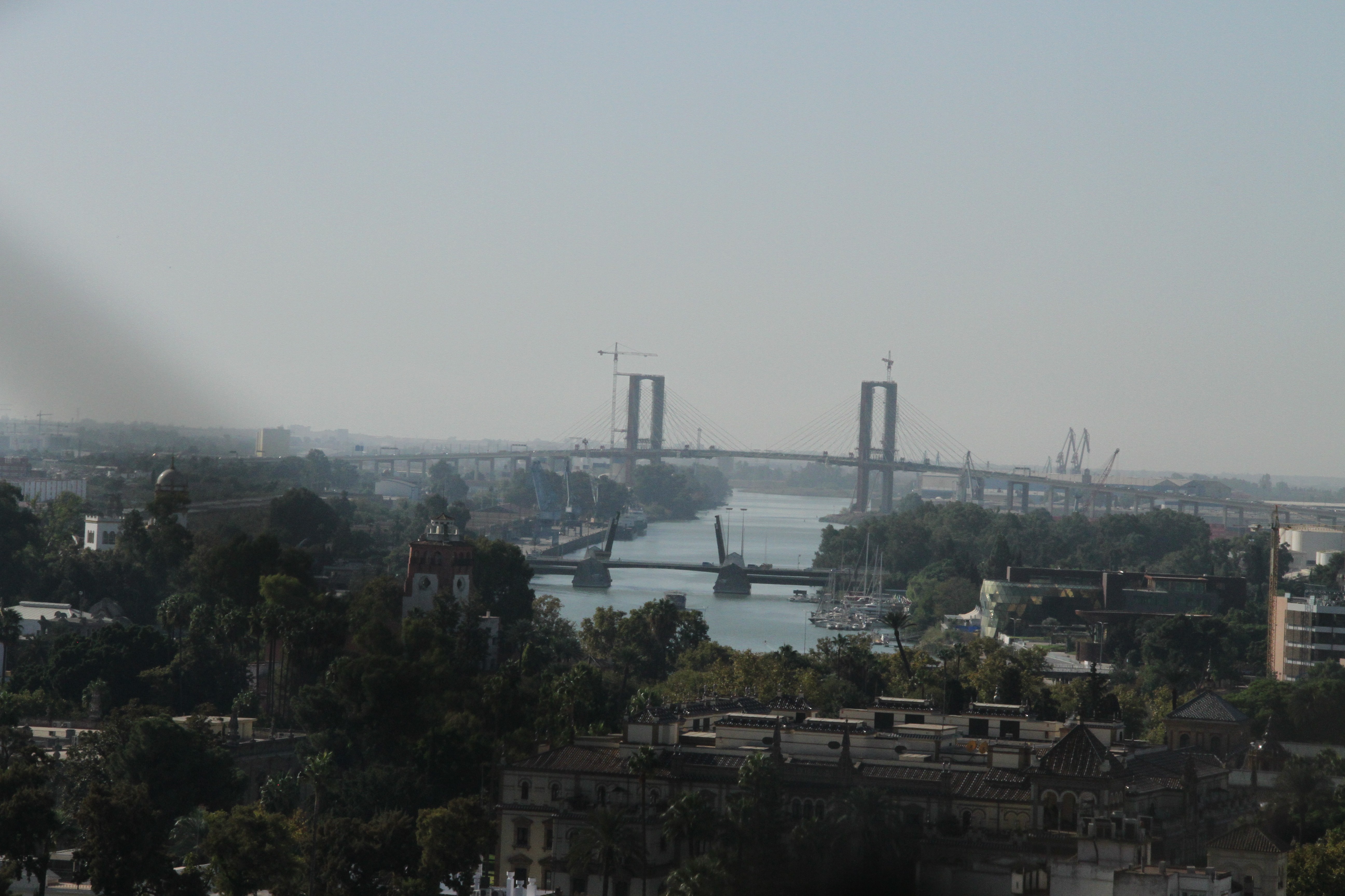En premier lieu, je suis monté en haut de la Giralda, la tour où on monte en tournant, d’où son nom. Une très belle vue se dessine sur Séville, et en particulier, ces ponts sur le Guadalquivir, le fleuve qui traverse la ville.
