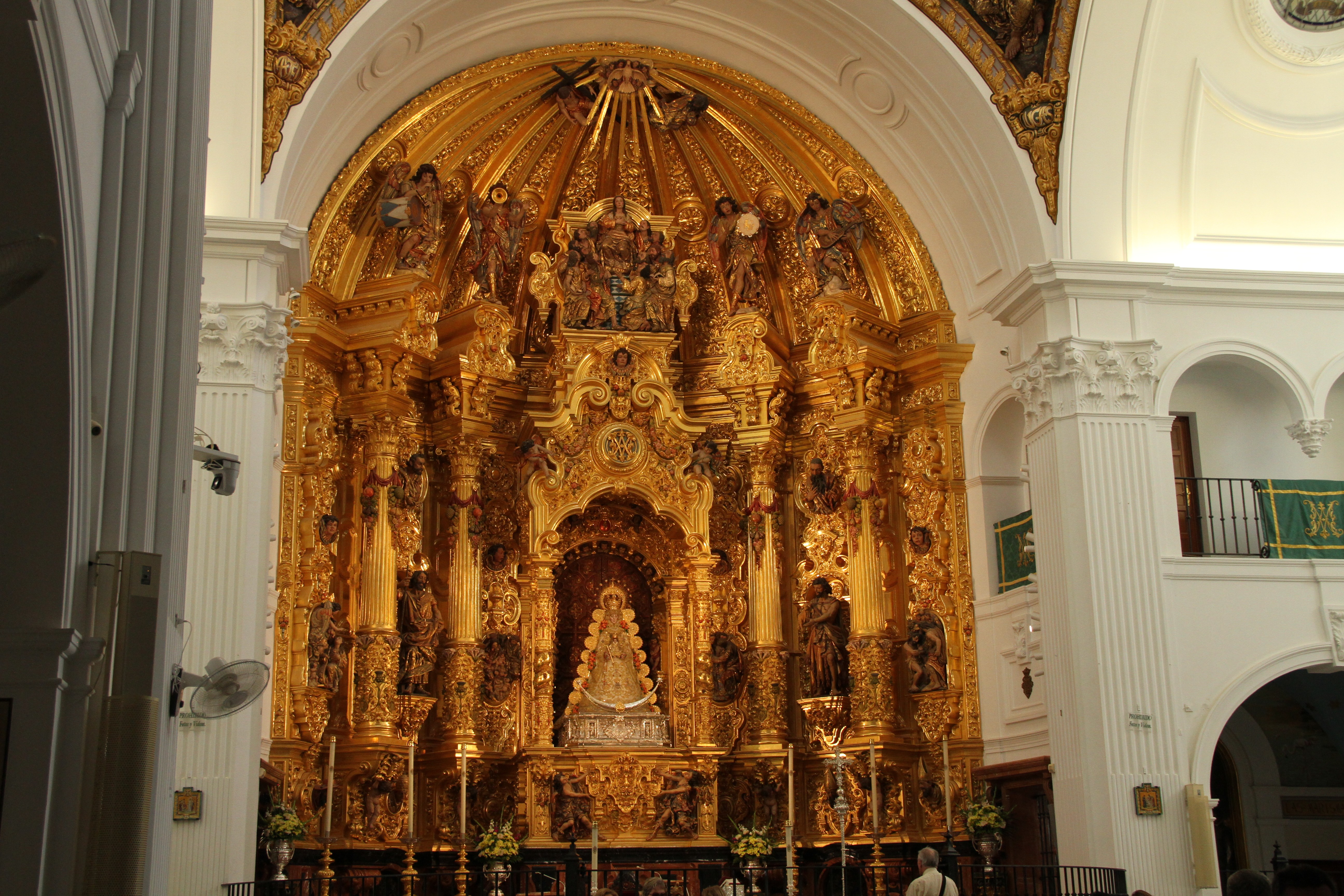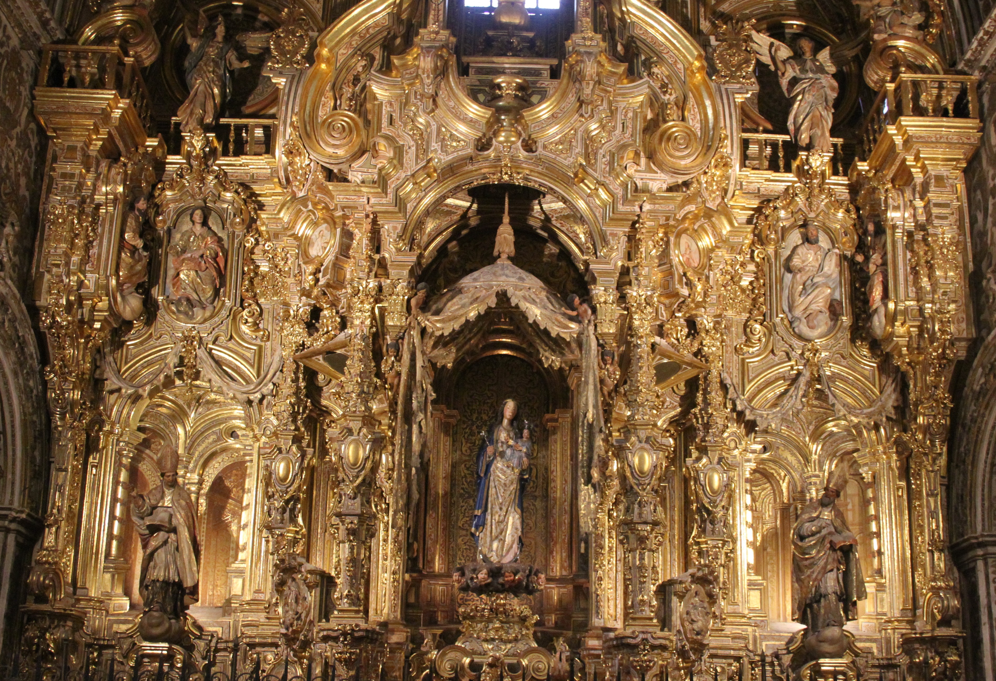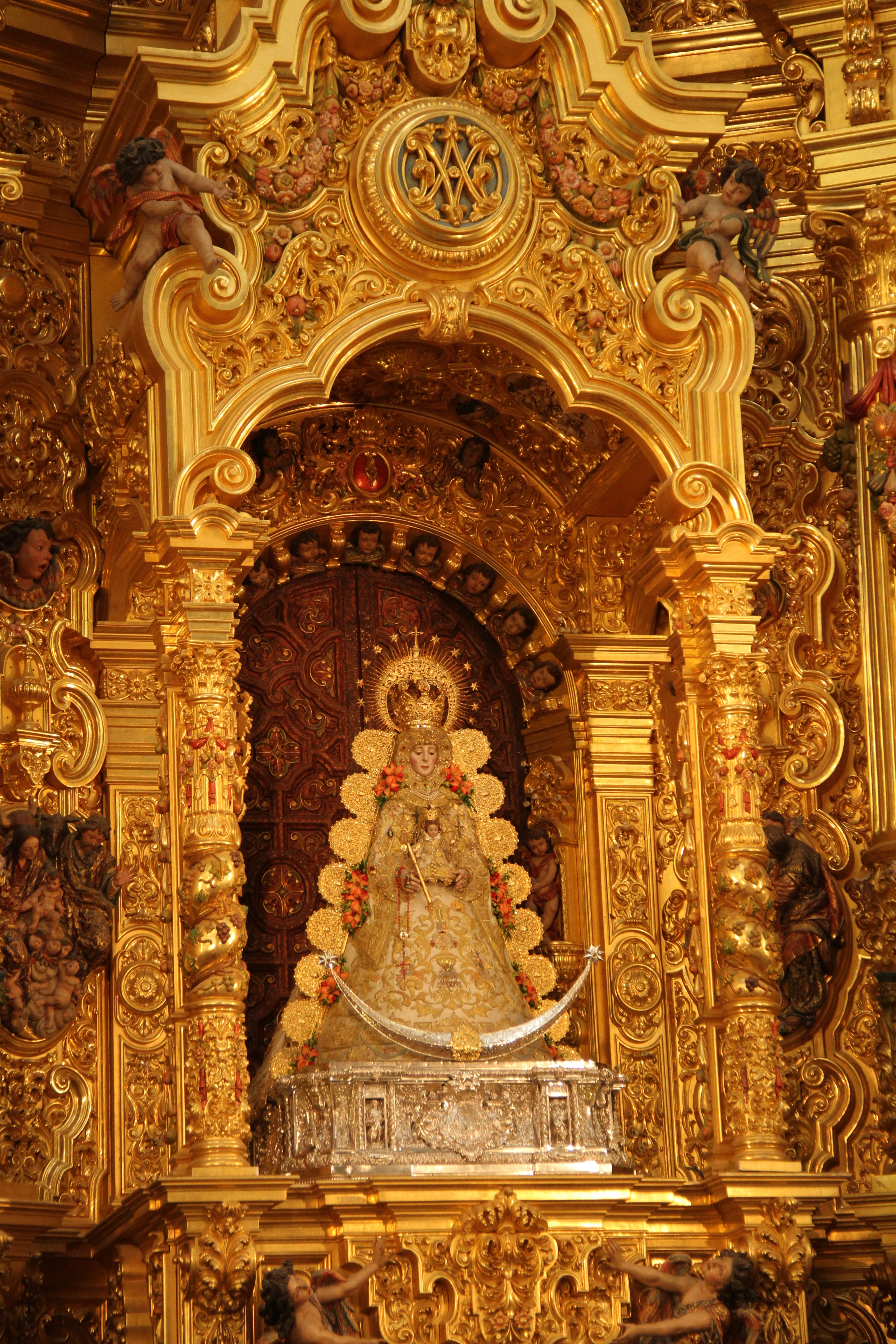 Elle est au coeur de l’église paroissiale. c’est le centre du rétable qui éclaire toute l’église. Je ne peux m’empêcher de vous montrer l’ensemble, qui est fort beau. C’est un baroque espagnol typique :