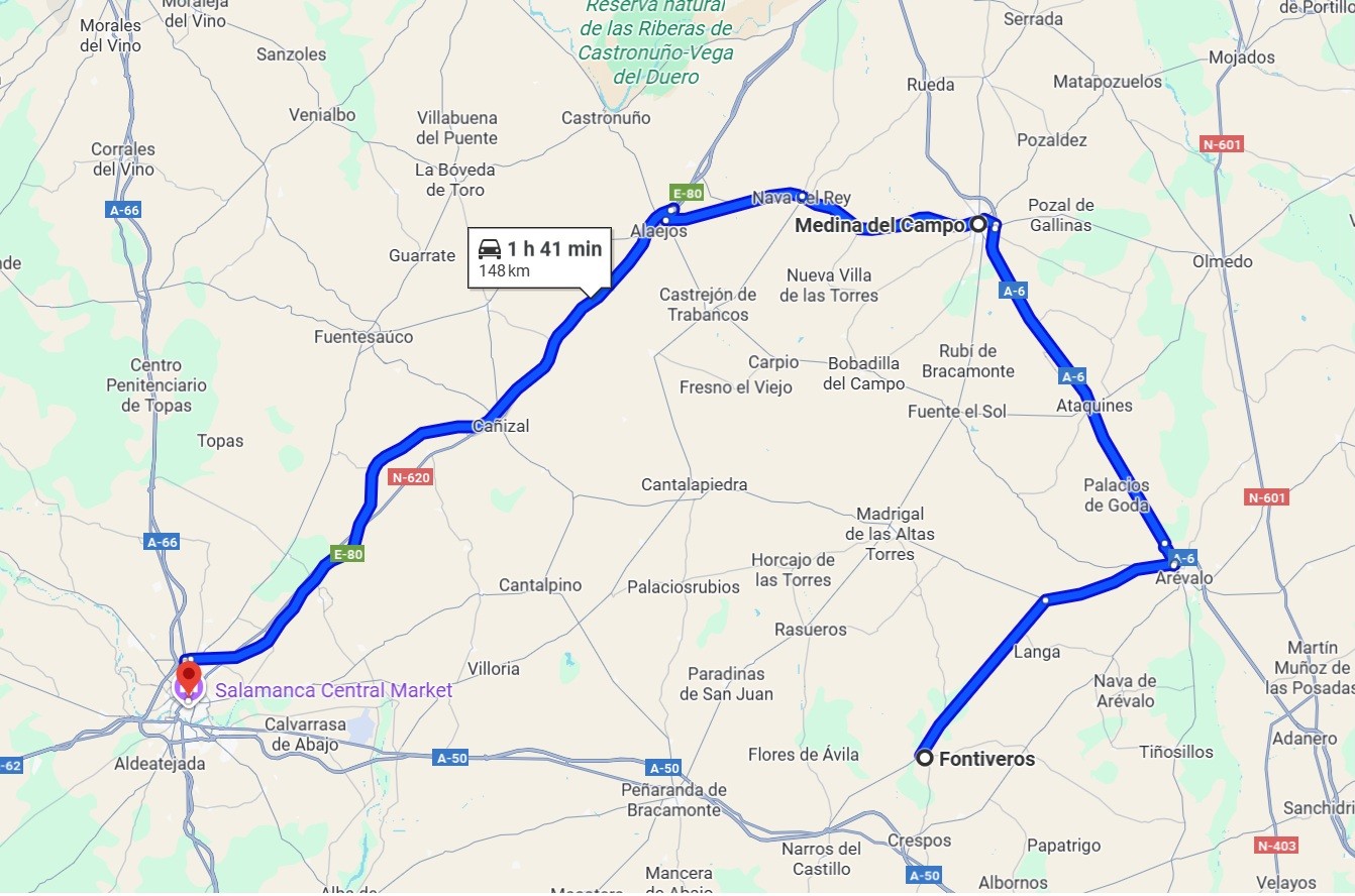 8h00 – Départ vers Salamanque, une bonne heure de route vers l’ouest, le soleil est dans le dos. La Castille se révèle et brille de mille feux. Je n’ai pas le temps de m’arrêter si je veux visiter un maximum de choses.