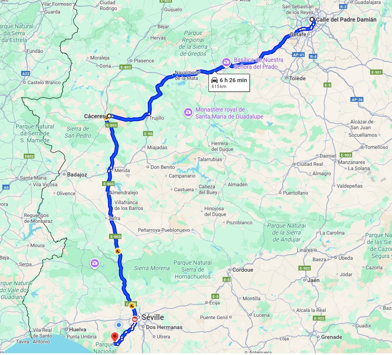 Départ donc ce matin à 10h00, arrivée à 13h00 à Caceres. J’ai fait la moitié du voyage pour aujourd’hui. Je crois aussi que j’ai fini le travail d’écriture pour ce soir. Je terminerai cette belle journée demain soir, après avoir visité la Doñana. Bonne nuit à chacun de ceux qui me lisent.