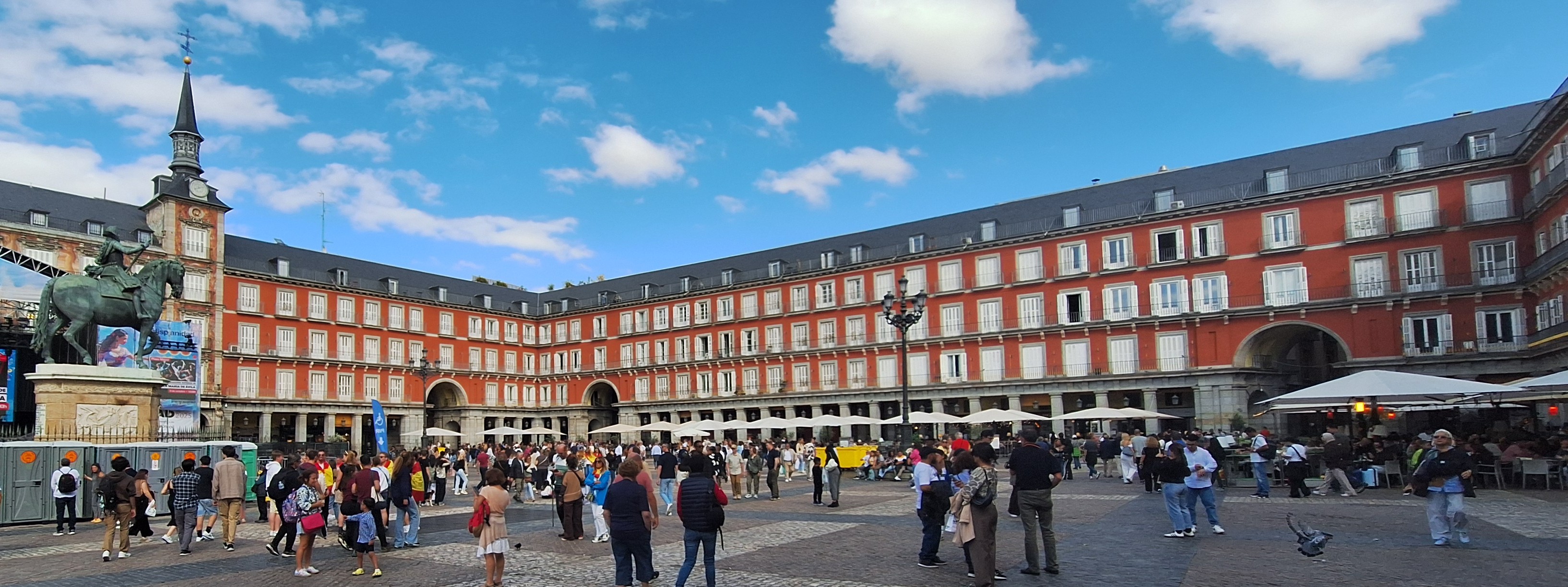La plaza mayor est plus calme que la plaza del Sol. Les gens se pressent surtout assis devant les bars où on consomme « tapas, cervezas y helados » sous le regard de la statue équestre du roi Philippe III (sur la gauche sous le clocheton). Il fait bon vivre au mois d’octobre dans la capitale madrilène.