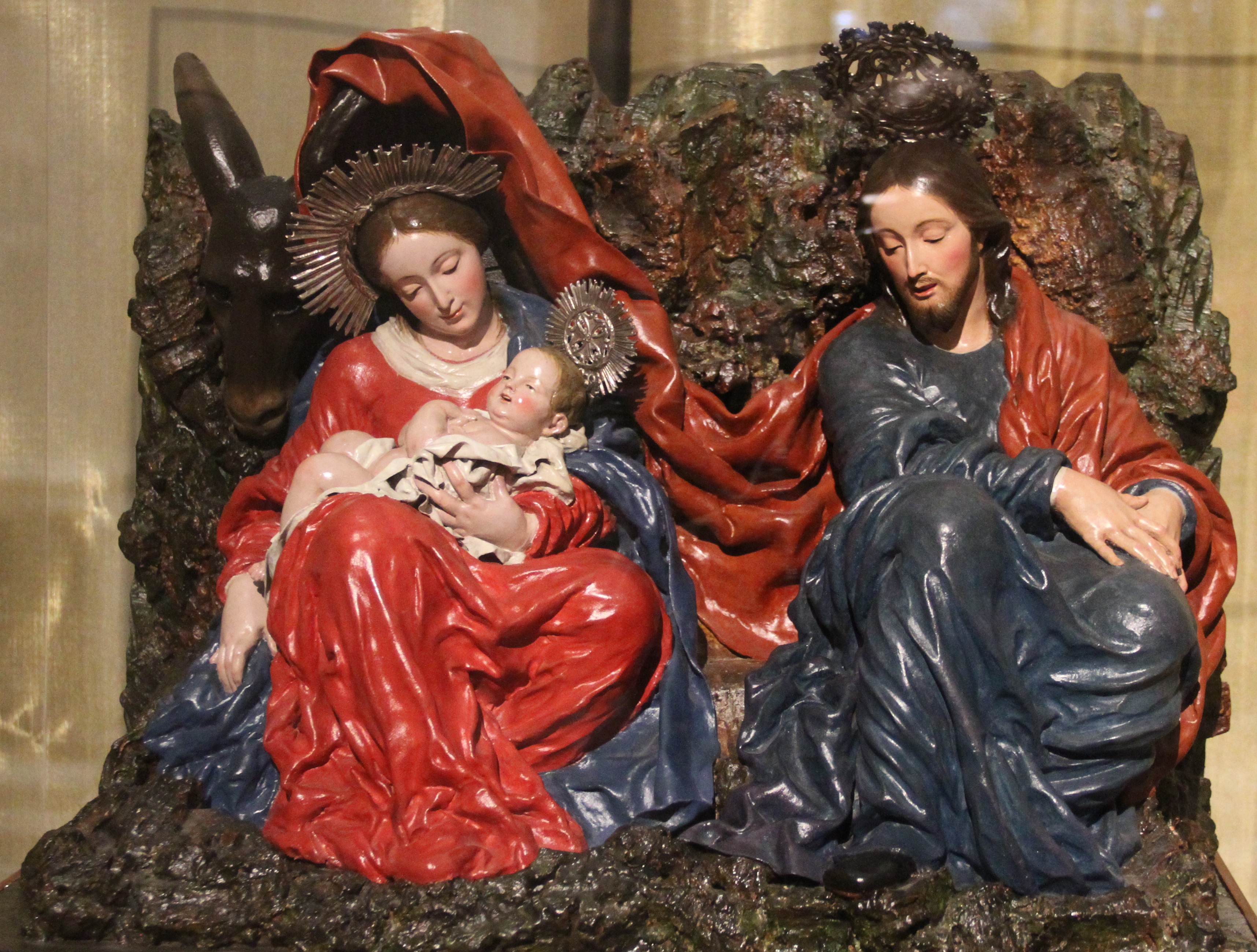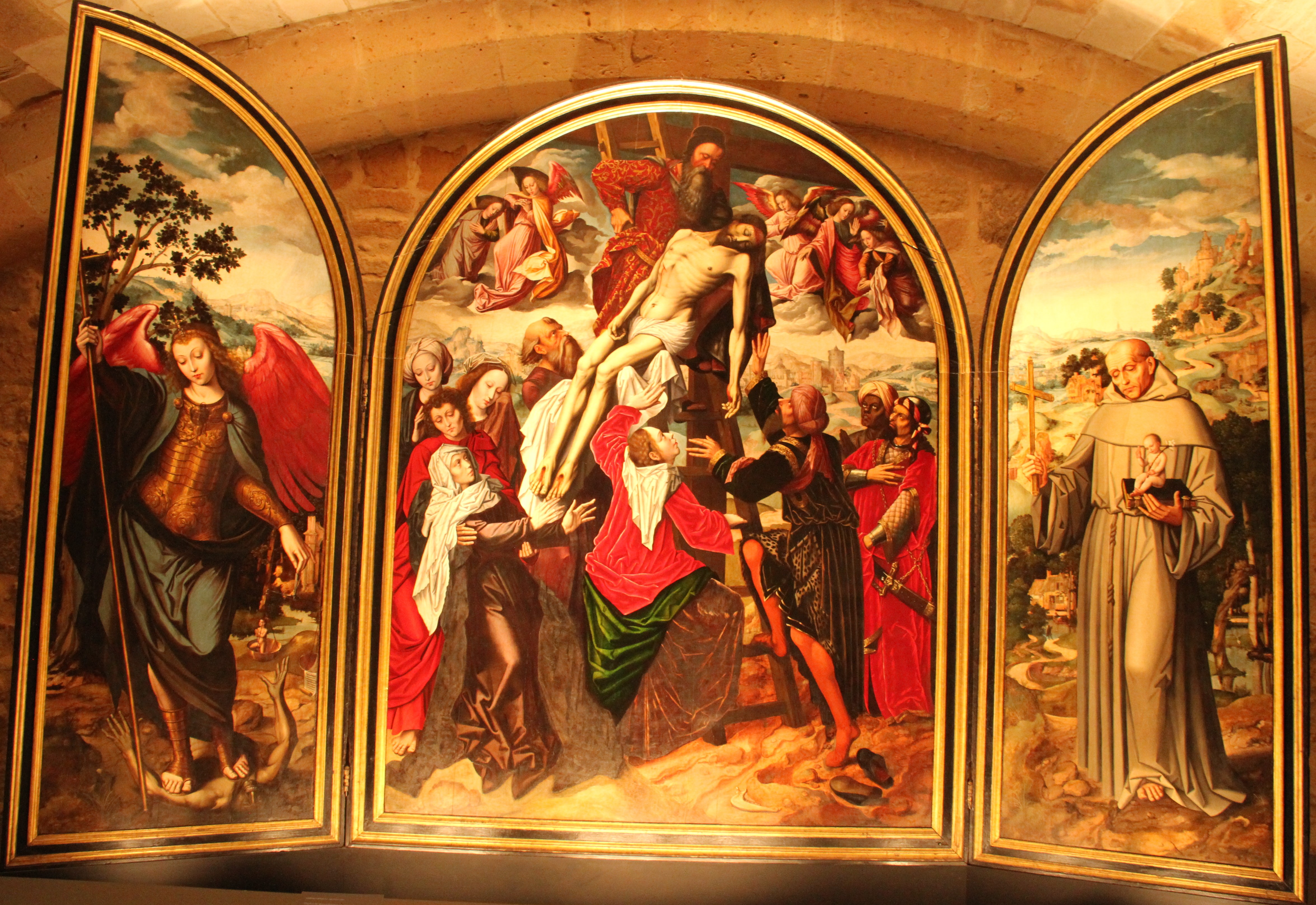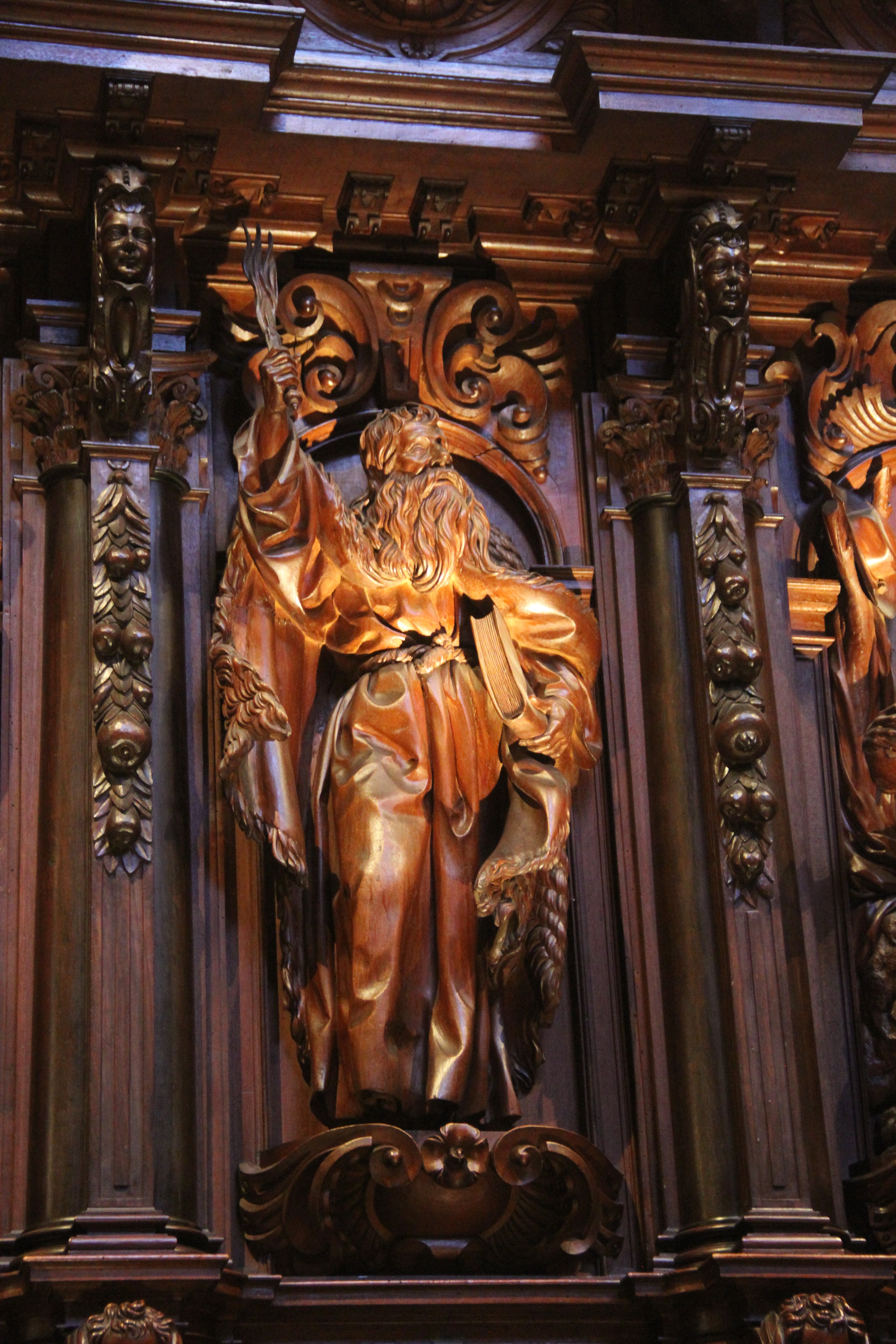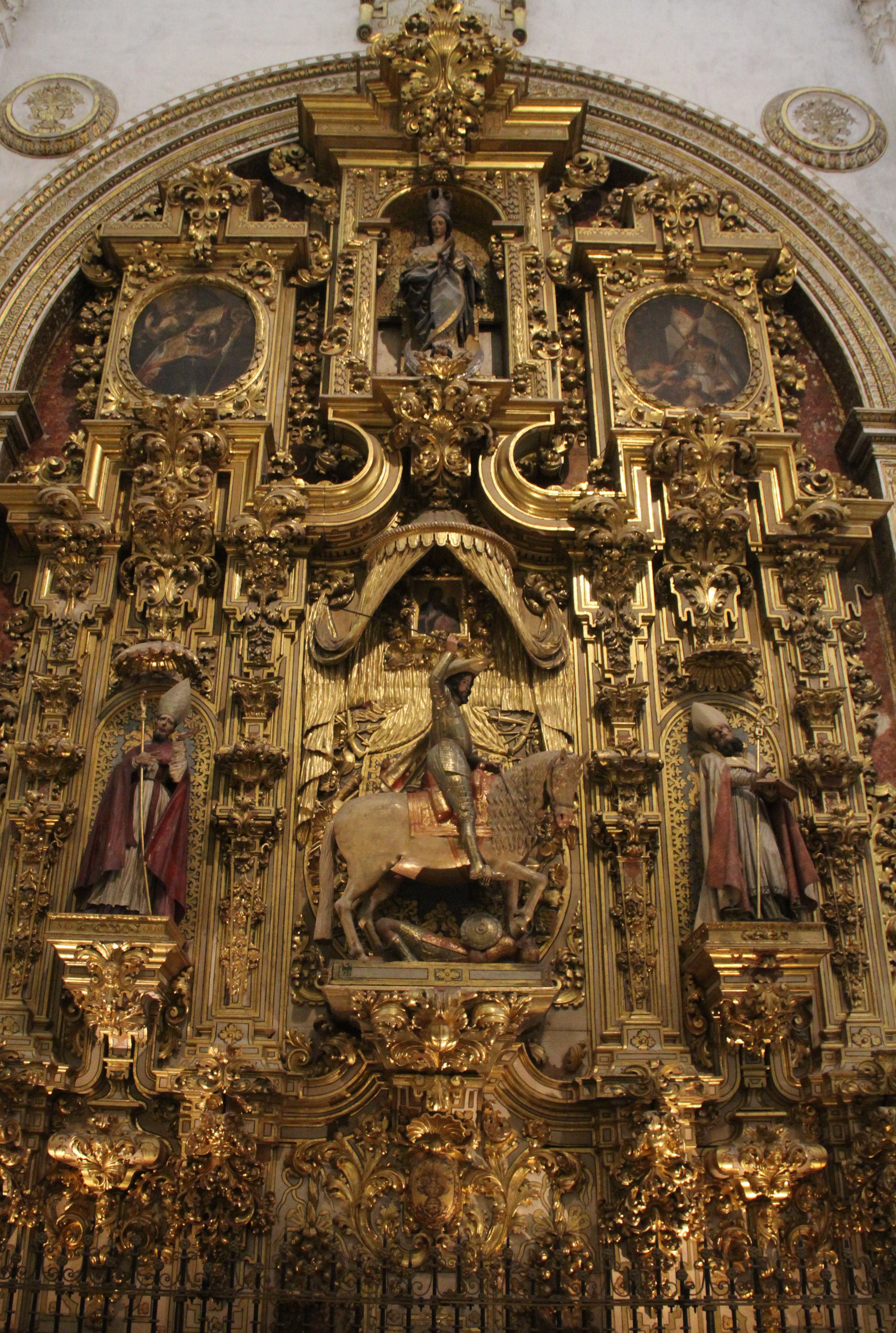 Le rétable central est réservé à la Mère de Dieu, Reine d’Espagne, au détour d’une exposition, j’ai repéré Joseph, Marie et l’Enfant jésus qui se reposent pendant la fuite en Egypte, enfin sur l’un des rétables, dans les chapelles autour du choeur, j’ai pu repérer ce chevalier, entouré de deux évêques.