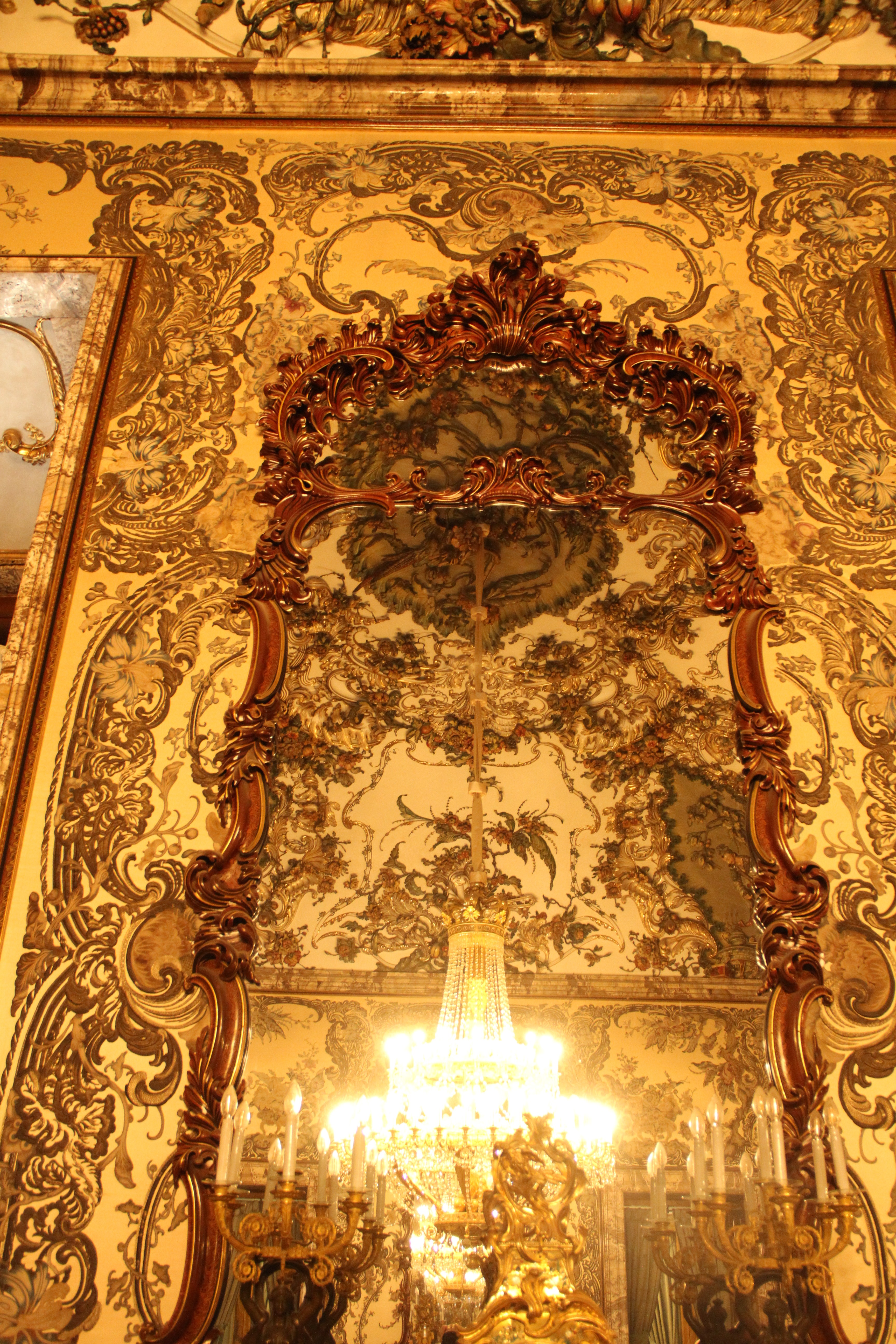 La salle jaune est toute harmonisée de jaune. Chaque décoration, chaque lustre, chaque glace donnent cette impression d’unité. Et en changeant de salle on change d’ambiance. C’est par moment déroutant de beauté. La seconde photo présente la salle d’apparat où on pouvait recevoir jusqu’à 137 personnes autour d’une même table.