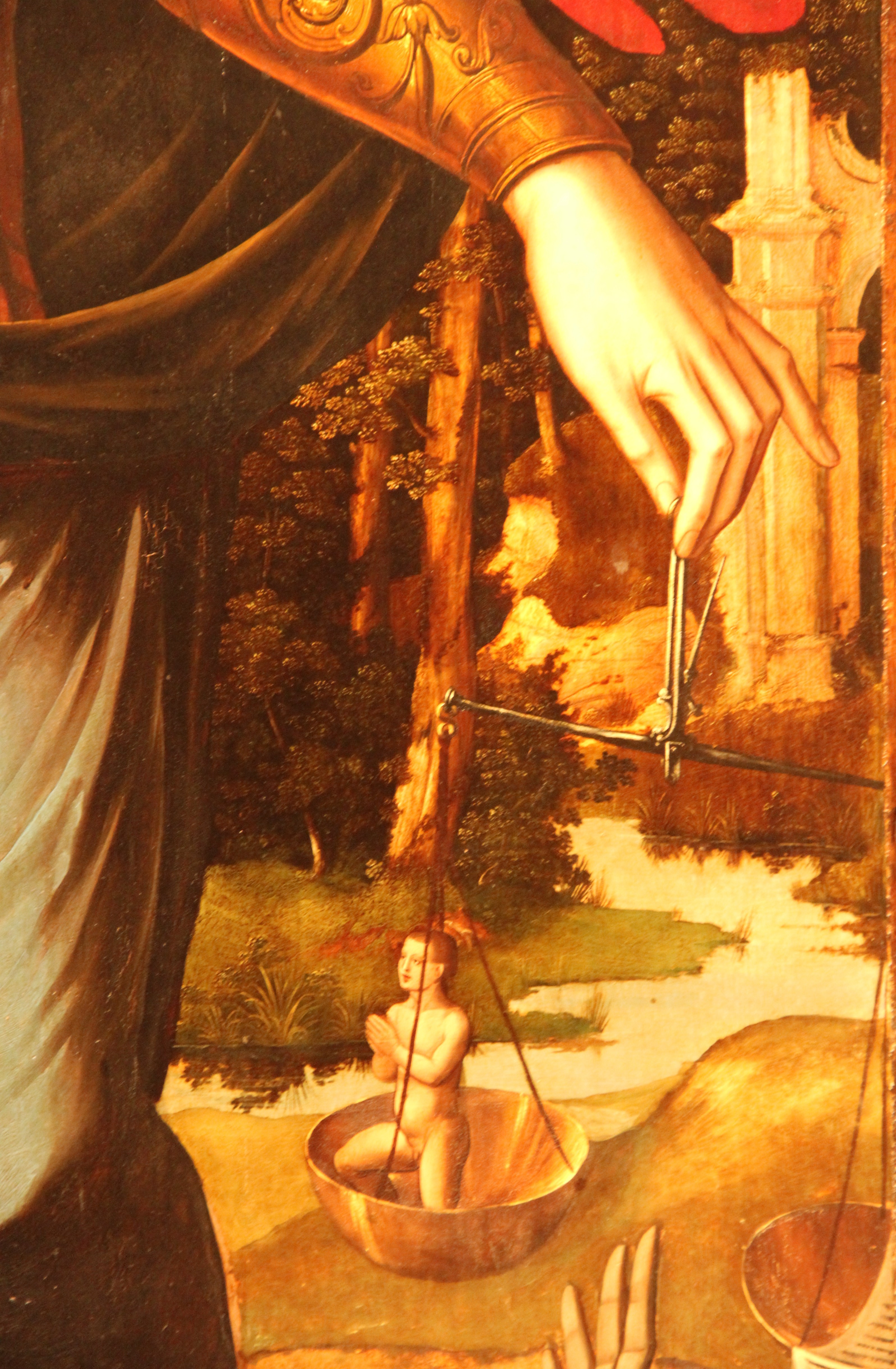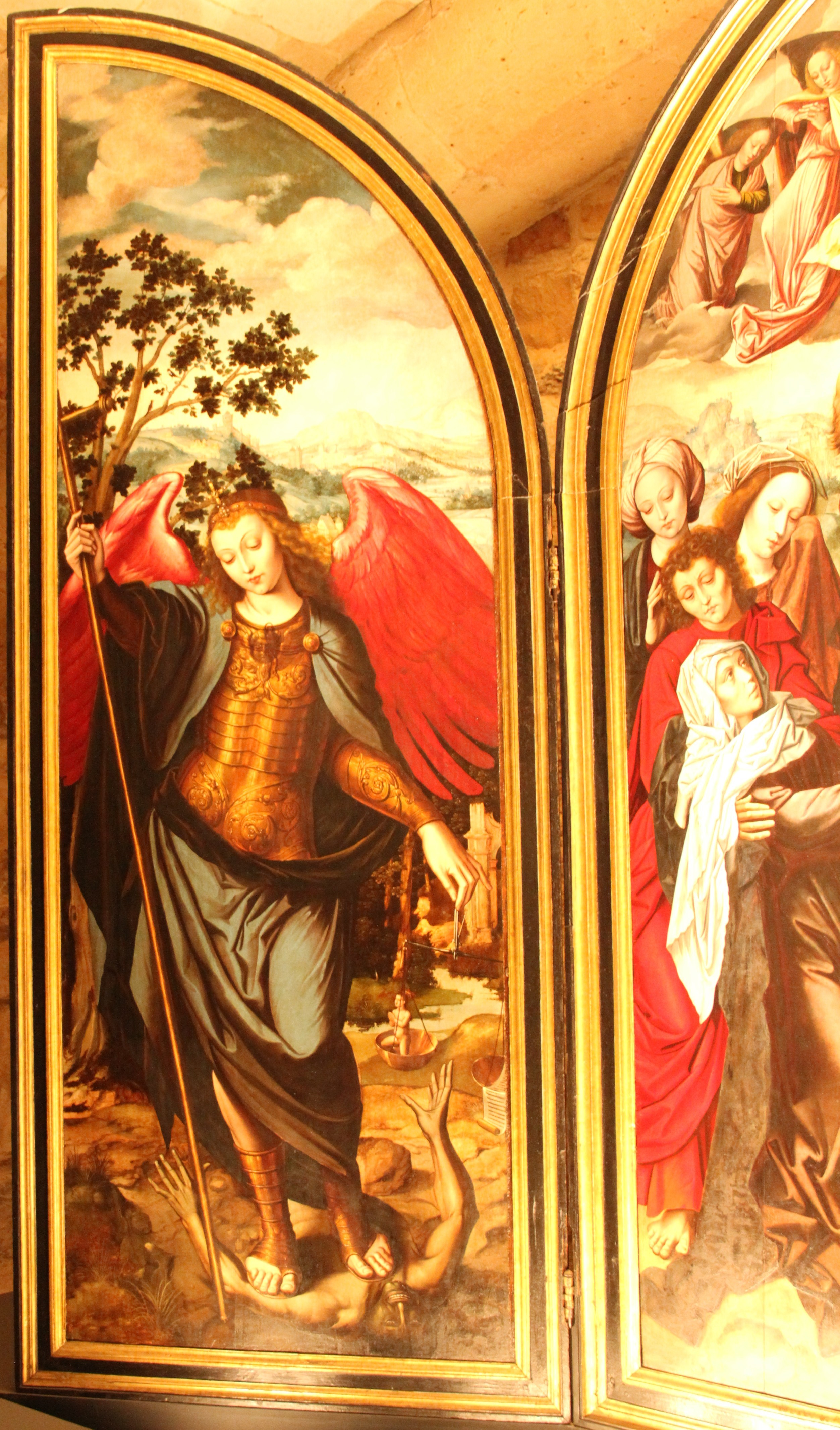 C’est une descente de croix, qui est ici représentée avec deux tableaux adjacents : à gauche, saint Michel, à droite saint Antoine de Padoue. En voici les raisons : nous avons ici un essai d’explication du mystère de la Rédemption : le Christ est mort, donc le salut est accompli par son sacrifice. Le diviseur, celui que la Bible appelle le « diabolos » est vaincu par Michel, qui porte, dans sa main droite, une balance qui pèse une âme.
