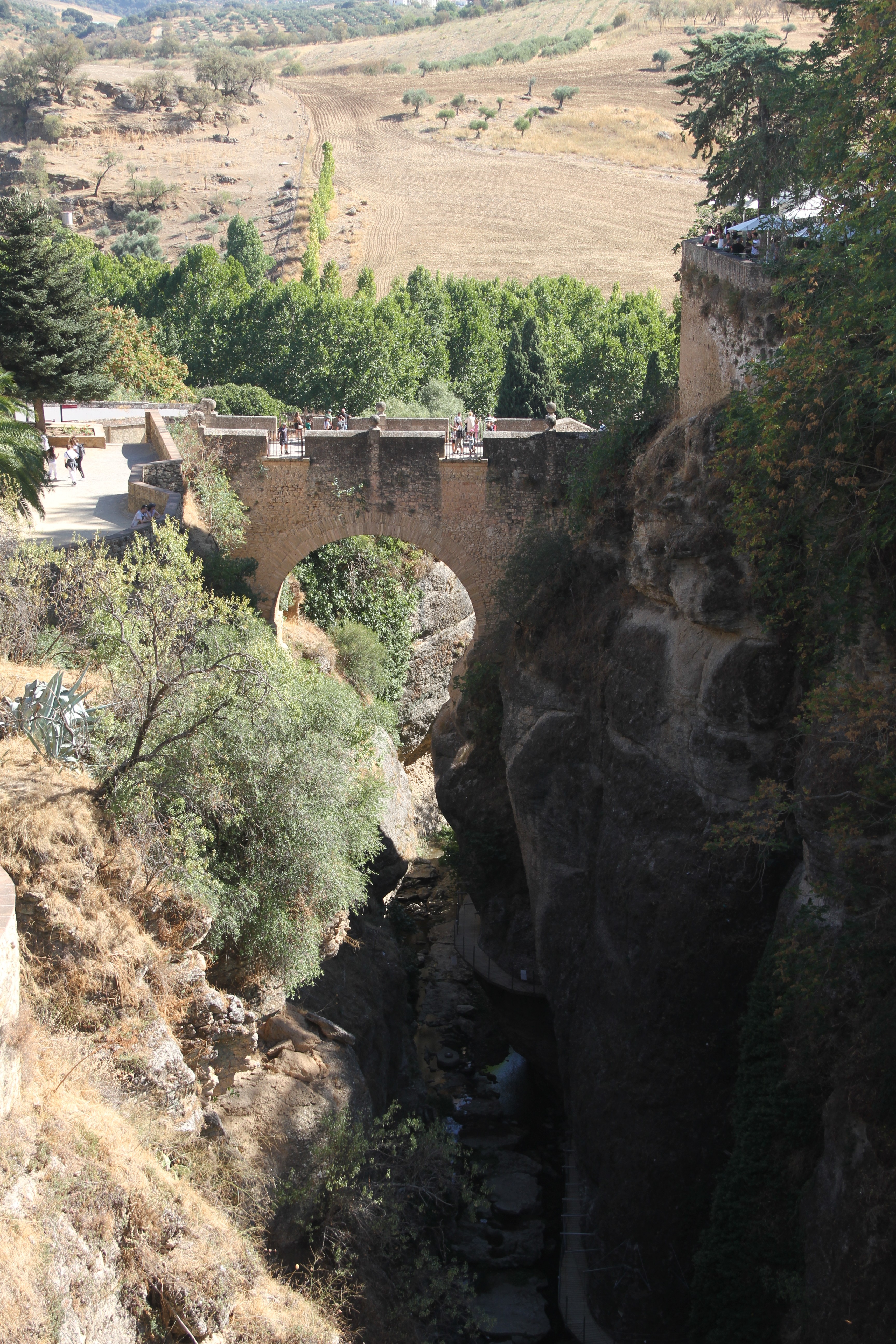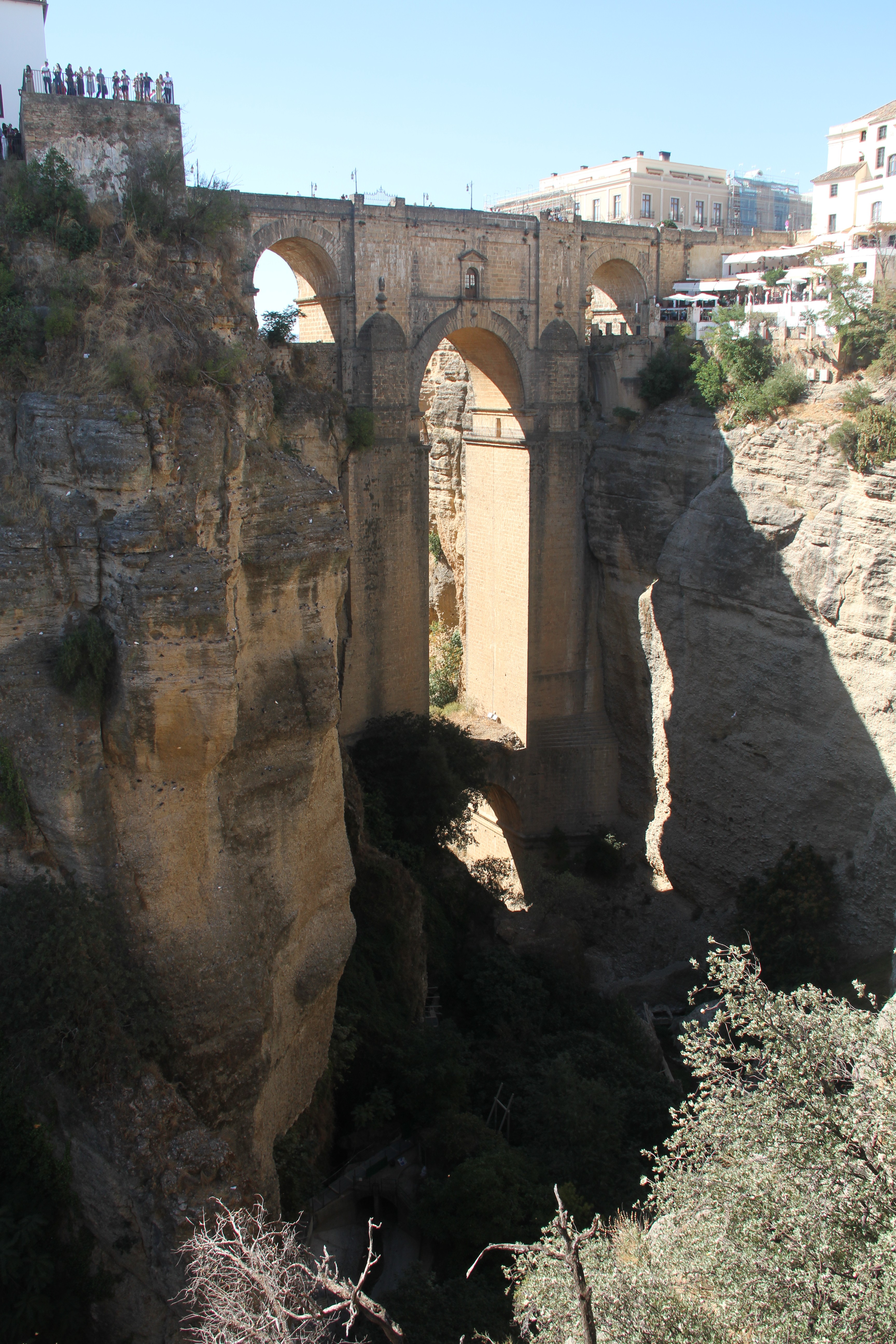 Et nous partons pour Ronda, qui est une petite ville. Au milieu passe le Guadalteba qui a creusé son lit très profond. Un pont enjambe la vallée pour permettre à la ville de ne pas être partagée en deux. Le premier pont permet une des entrées de la ville, c’est la première photo. Le second permet la vie de la ville.