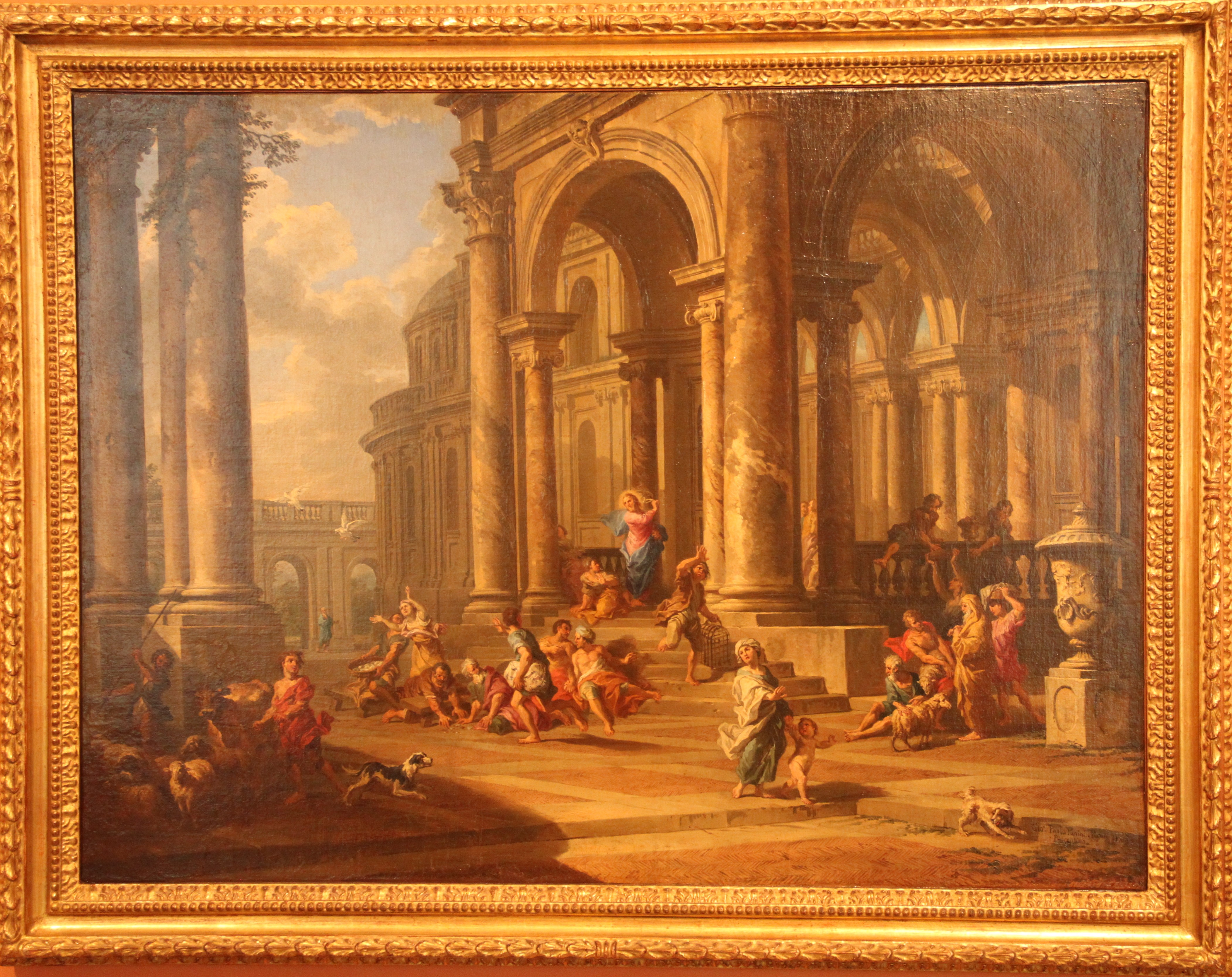 Nous commençons par une image de la renaissance, très italienne. Elle est peinte par Giovanni Paolo Panini en 1724. Il s’agit de Jésus qui chasse les marchants du Temple.