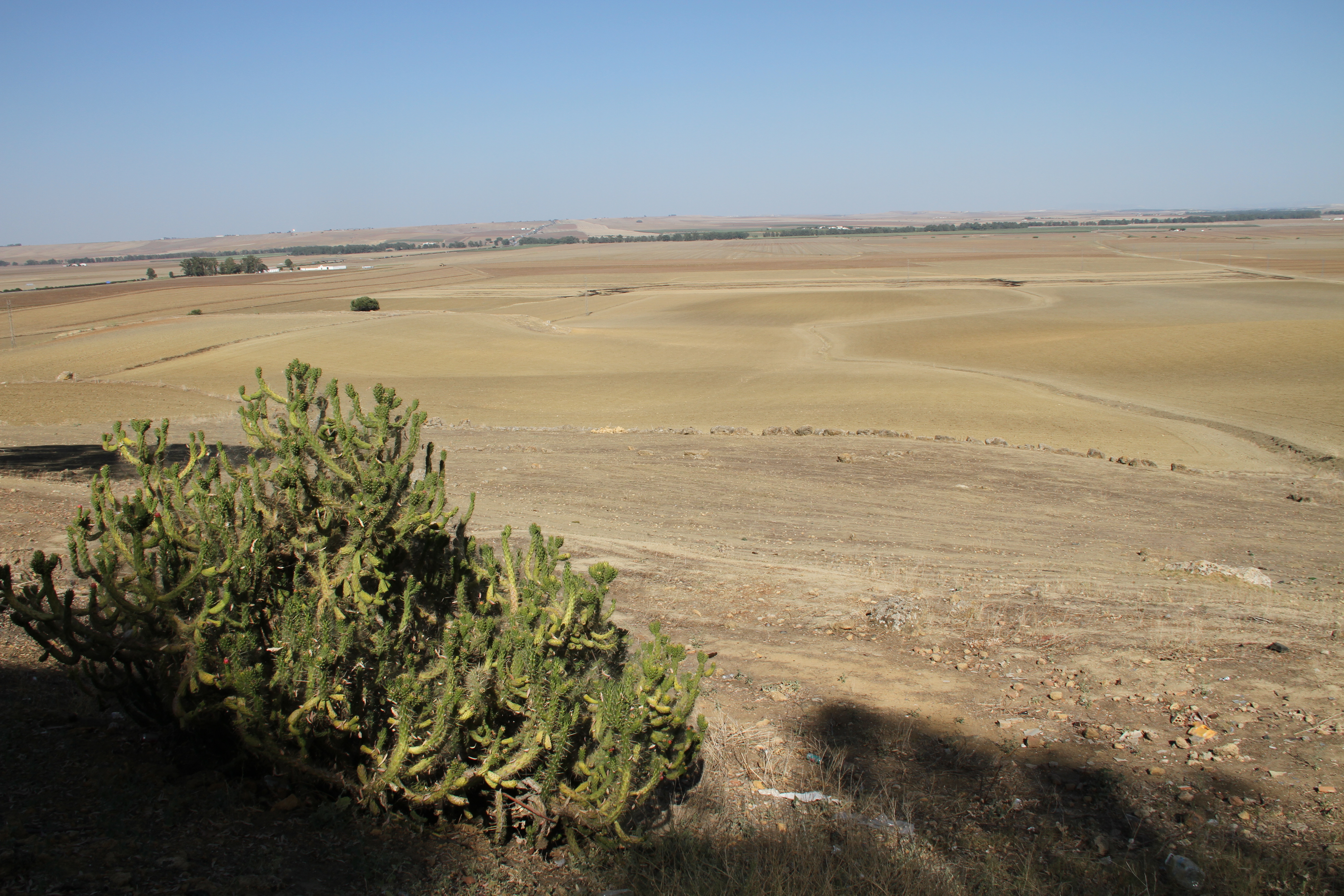 Au premier plan: un cactus et vers l’infini la sécheresse et les champs moissonnés depuis longtemps où pas une touffe d’herbe n’est verte. Nous ne sommes pas éloigné d’une région désertique. Par endroits, les seuls espaces verts, ce sont les plantations d’amandiers, d’oliviers ou d’orangers qui sont alimentés en eau par un goutte à goutte.
