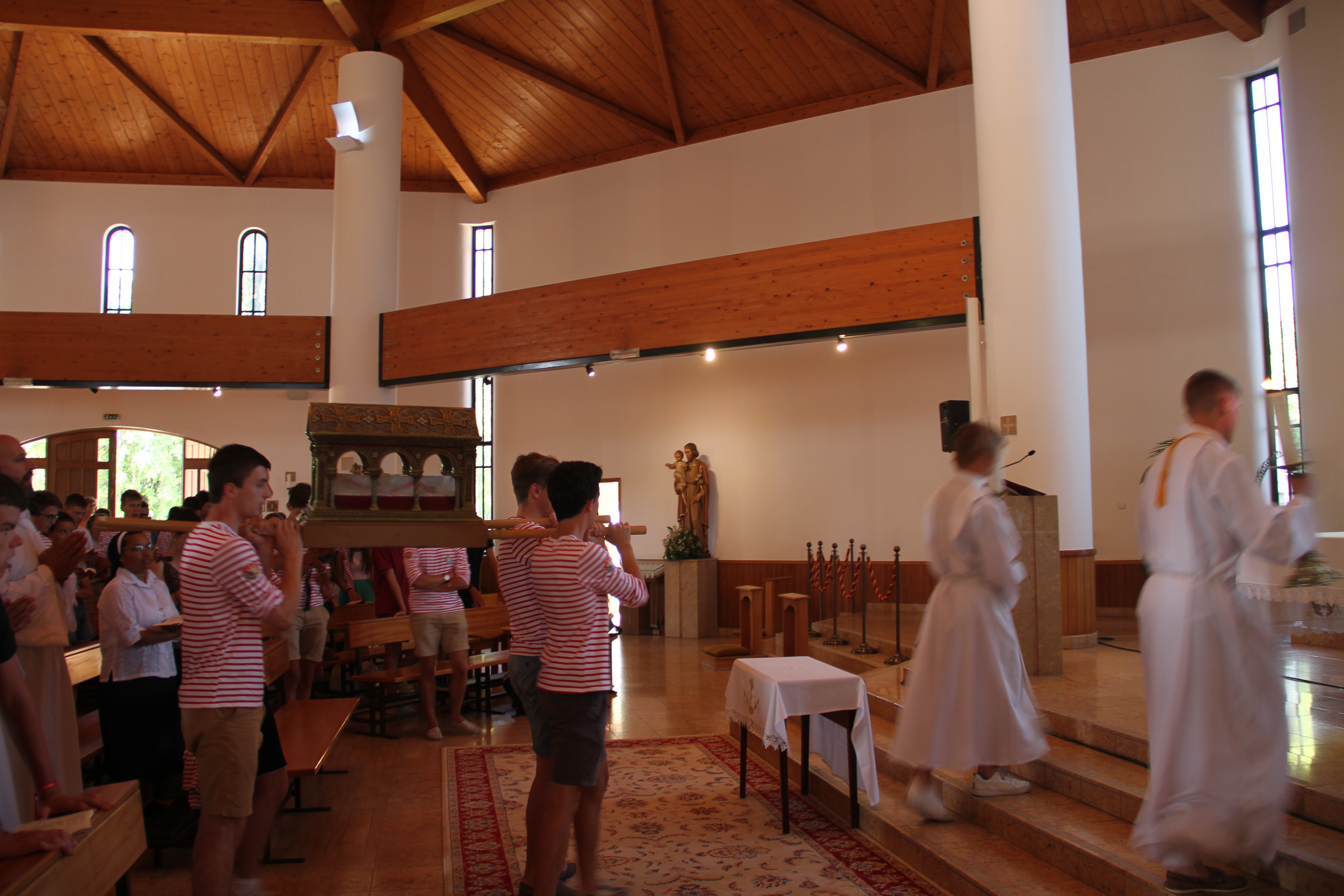 La représentation se prépare dehors, devant l’église paroissiale. Le vent sera quelque peu taquin avec notre écran. Une petite heure de spectacle, puis, présentation de la relique de sainte Marguerite Marie et le dernier tableau suivi d’un moment d’adoration eucharistique. Ainsi nous avions l’impression que notre vocation à la prière durant les représentations était vraiment mise en oeuvre ici.